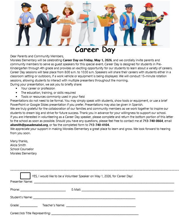 We are seeking Career Day presenters to visit our campus and share their knowledge and professional experiences with our students. Presentations can be done in Spanish, as well. If you are interest...