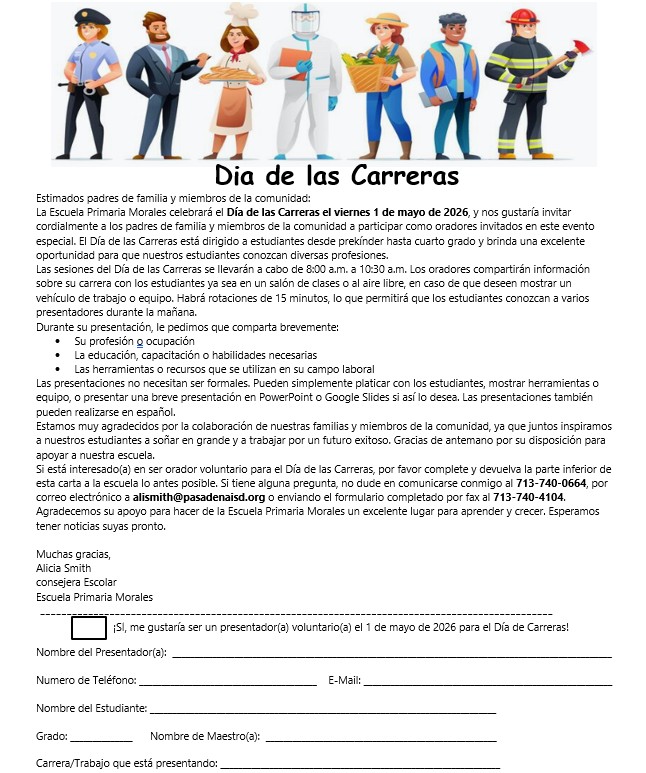 We are seeking Career Day presenters to visit our campus and share their knowledge and professional experiences with our students. Presentations can be done in Spanish, as well. If you are interested in participating, please comment on this post or contact our School Counselor, Alicia Smith, at alismith@pasadenaisd.org or (713) 740-0664 ext. 57156.
