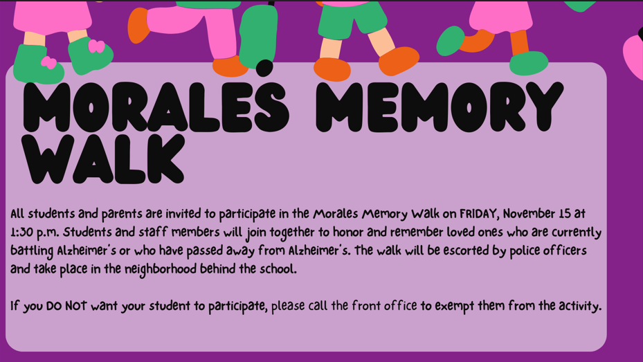 Save the date to join your student in our annual Walk to End Alzheimer's, Friday, November 15th, Parent's will need to check in the office starting at 1:00 p.m. and then meet their student in the back of the school. Our walk will begin at 1:30 p.m.